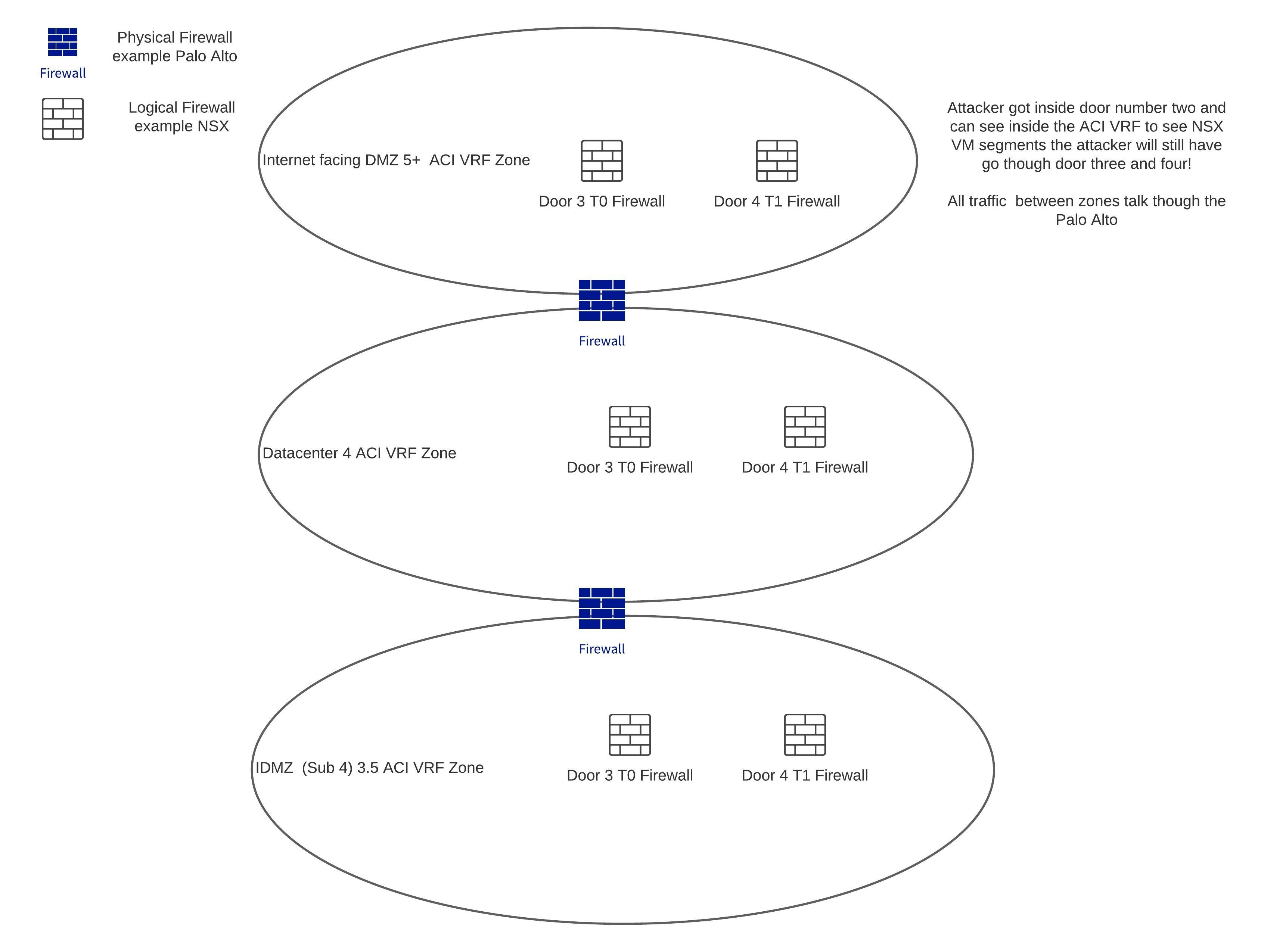 So I have an ACI zone that layers above my physical switch’s that can’t see the NSX network without passing through a stateful firewall. If the attacker gained access to inside T0, the T1’s would provide another control point, and beyond that, transport zones can restrict access further.